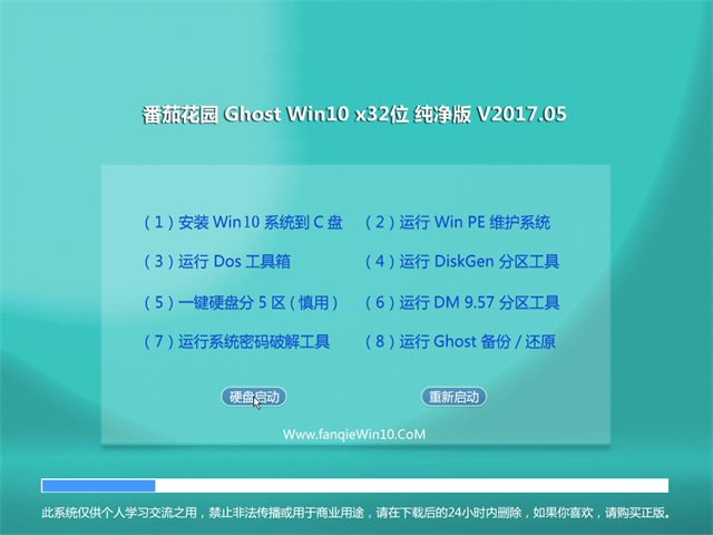 番茄花园Win10x32位纯净版系统仅用于进行演示基于万能GHOST的快速部署技术,除了系统和光盘中明确标识为原创 作品的软件外,其他的全部文件归属于原版权人所有。我们不承担任何技术和版权问题,没有提供任何技术支持的义务.请勿将本系统用于商业用途。