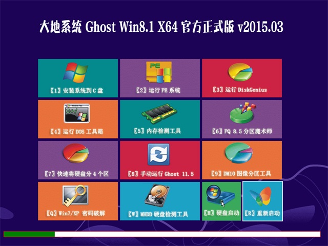 小编这里要为大家带来的是一款大地系统 Ghost Win8.1 64位 官方正式版 v2015.03拥有新操作系统所有的消费级和企业级功能,本系统支持加入管理网络、高级网络备份等数据保护功能、位置感知打印技术,加强网络的功能,修改注册表减少预读取、减少进度条等待时间,修改QoS数据包调度程序,加快上网速度,屏蔽了常见的流氓插件,并将虚拟内存转移到其他盘,支持Windows下一键全自动快速备份/恢复系统,装机维护轻松无忧,欢迎大家下载使用!