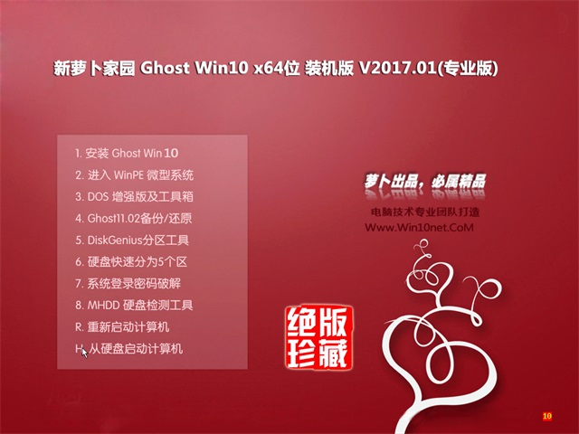 新萝卜家园Ghost Win10x64位2017年1月版本在不影响大多数软件和硬件运行的前提下,已经尽可能关闭非必要服务。新萝卜家园Win10x64位重点突出功能上的方便实用、高效,风格上的简约。系统兼营性、稳定性、安全性较均强,完全无人值守自动安装。新萝卜家园Win10x64位集成OneNote功能,方便用户进行记录,标注与分享,支持PDF文件显示。集成了最新的硬件驱动,首次进入系统即全部硬件已安装完毕。新萝卜家园Win10x64位数几十项优化注册表终极优化,提高系统性能。增加虚拟桌面,即使建立多个桌面,也能在不同的桌面上运行不同的程序。触控手势功能只要用手指划一划即可操作。新萝卜家园Win10x64位首次登陆桌面,后台自动判断和执行清理目标机器残留的病毒信息,以杜绝病毒残留。