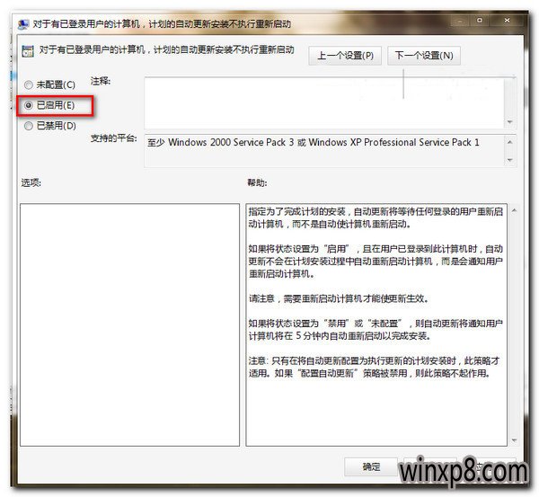 把“对于已登录的用户,计划的自动更新安装不执行重新启动”选项设置成已启用。